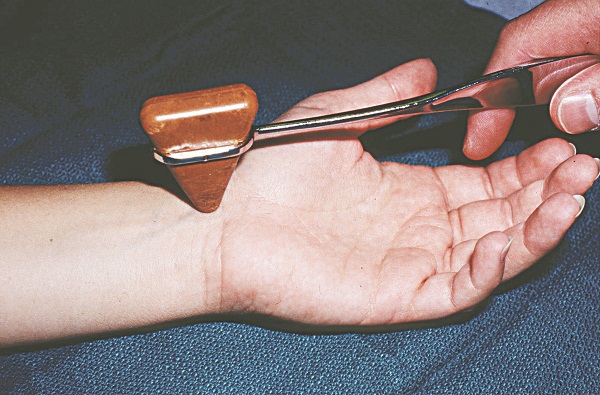 - Ấn vùng ống cổ tay: Người khám dùng một hoặc hai ngón tay cái ấn lên phía trên dây thần kinh giữa đoạn ống cổ tay của bệnh nhân trong 30 giây. Trong hội chứng ống cổ tay sẽ gây ra cảm giác tê hoặc đau theo chi phối của dây thần kinh giữa ở bàn tay.